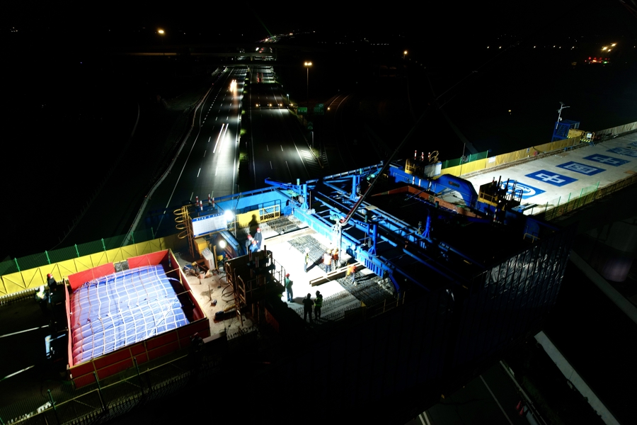 据悉,海盐特大桥跨杭浦高速连续梁位于浙江省嘉兴市海盐县百步镇境内,全长221.7米,主跨100米,设计为单箱单室变截面连续箱梁结构,浇筑混凝土总方量达4446立方米。该桥梁位于杭浦高速上方,高速上来往车流量大,面临组织协调难、安全风险高、施工难度大等困难。